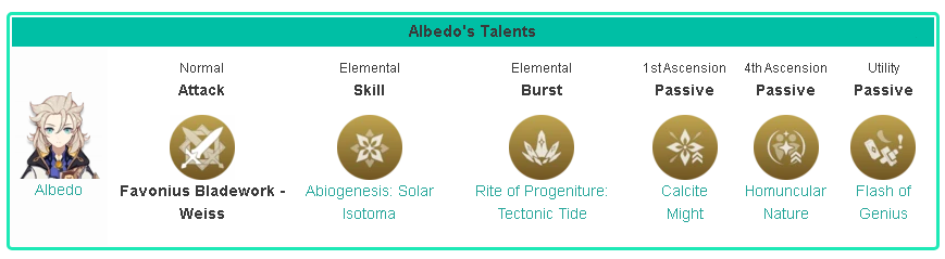 - اگر ایزوتومای خورشیدی ایجاد شده توسط خود آلبدو در زمین باشد، 7 شکوفه Fatal در قسمت Solar Isotoma تولید میشود و به شدت شکوفا میشود و AoE Geo DMG را وارد میکند.