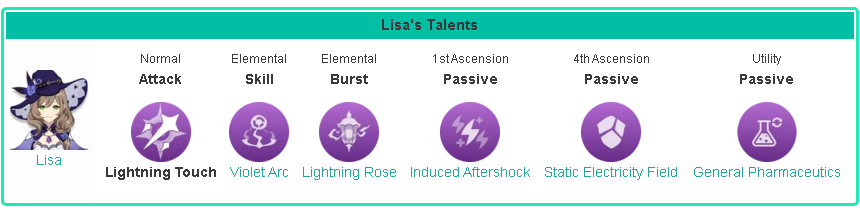 - ضربه خوردن دشمنان از لیزا رسانا در آنها ایجاد میکند. (در نهایت دشمنانی که این قابلیت روی آنها به وجود می اید دمیج اضافه تری از المنتال اسکیل لیزا دریافت میکنند)