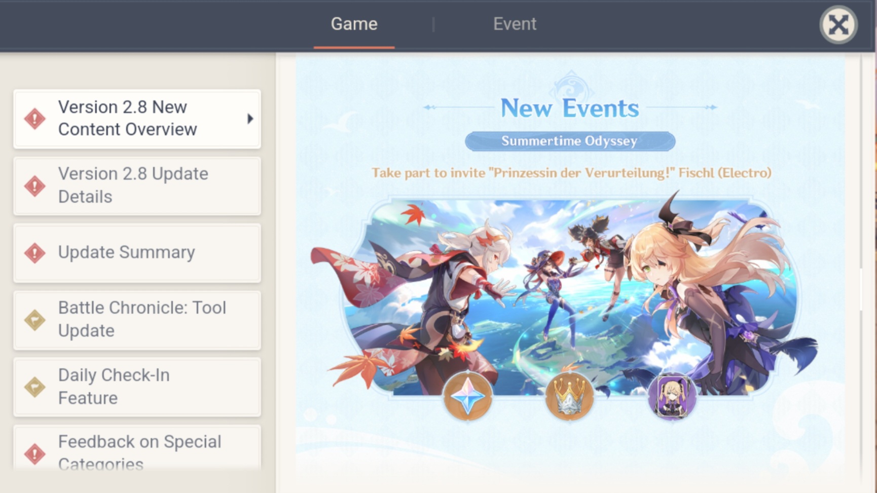 همچنین Summer time Odyssey ایونتی هست که میتونید اسکین شخصیت Fischel رو بصورت رایگان دریافت کنید به همراه جوایز دیگه از جمله Crown of insight و پریموجم. یادتون باشه این ایونت رو از دست ندید اگر برای فیشلتون اسکین جدید میخواید! 😃