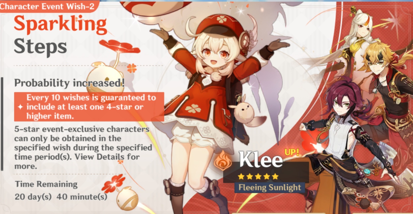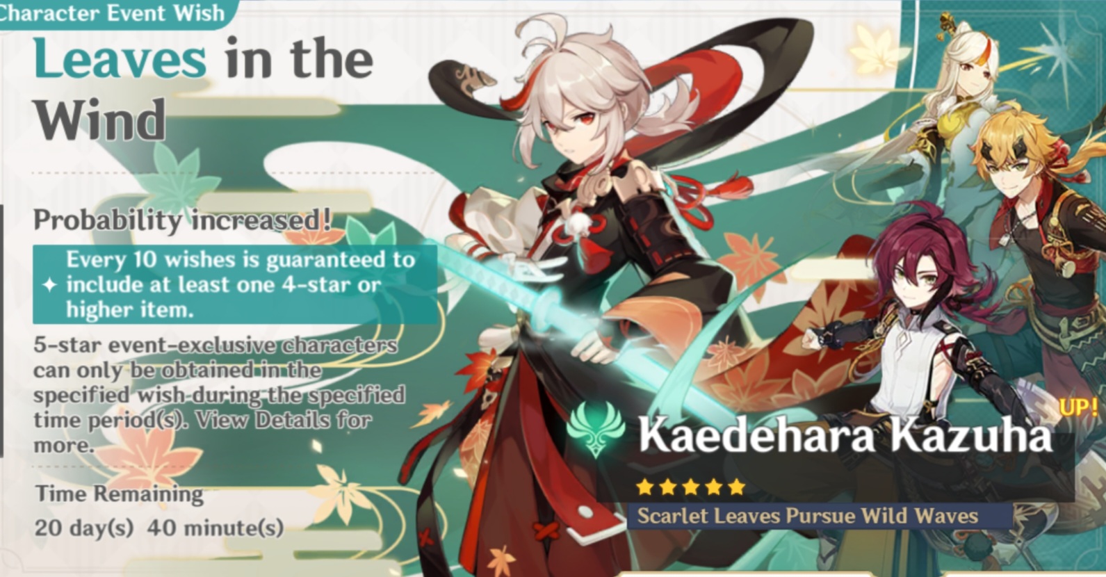 در این ورژن شاهد بازگشت دو کاراکتر آشنا هستیم که Kazuha و Klee هستن. همچنین اضافه شدن کاراکتر 4 ستاره جدیدی به نام Heizou که از دوستان Kazuha هست در اینازوما. شما با هر 10 ویش قابلیت دریافت یک 4 ستاره رو دارید که از 4 ستاره های دو بنر مجزا Kazuha و Klee میتوان به Heizou, Ningguang و Thoma اشاره کرد.