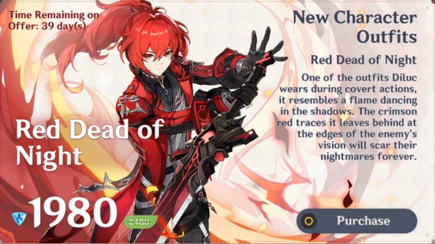 اسکین جدید پر طرفدار دیگه ای که گنشین به بازی اضافه کرده برای کسی نیست جز Diluc. که این اسکین مثل اسکین Fischel رایگان نیست و باید براش خرج کنید. اگر F2p هستید که هیچ، اگر دوست دارید این اسکین رو بخرید به شاپ برید و با Genesis crystal هاتون این اسکین جذاب رو دریافت کنید. این اسکین با انیمیشن جدیدی برای دیلوک میاد و ظاهر اون رو به کلی تغییر میده. Red Dead Of Night اسم این اسکین جدید هست که متقاضیان زیادی حتی از قبل ارائه داشته. با مدت محدود با 1980 Genesis crystal میتونید اون رو دریافت کنید. در غیر این صورت قیمت اصلی این اسکین 2400 crystal براتون خرج میبره...😬