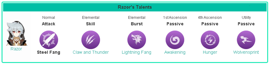 گرگ در کنار حملات عادی Razor حمله میکند، Electro DMG وارد می کند و Razor's ATK SPD و Electro RES را بالا میبرد.