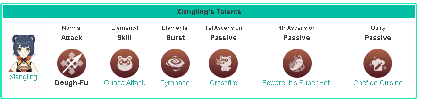 - المنتال برست ژیانگلینگ یک Pyronado آتشین (مانند یک میدان کوچک آتشین ) که به دور خود میچرخد و به دشمنان Pyro DMG وارد میکند را تشکیل میدهد.