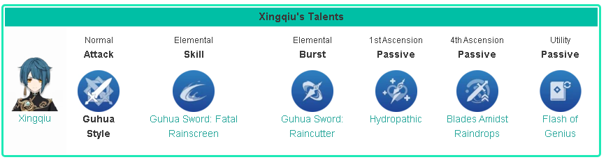 - وقتی یک شمشیر بارانی ( بعد از فعال سازی المنتال اسکیل به وجود میاید ) از بین برود یا تایم آن تمام شود، کاراکتر اکتیر را هیل میکند بر مبنای 6% مکس خون Xingqiu.