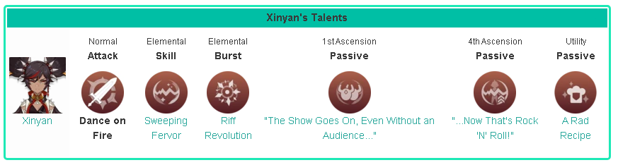 - شینیان گیتار خود را به دست میگیرد و ساز میزند که این حرکت Pyro DMG به دشمنان اطراف وارد کرده و یک شیلد پایرو تشکیل میدهد.