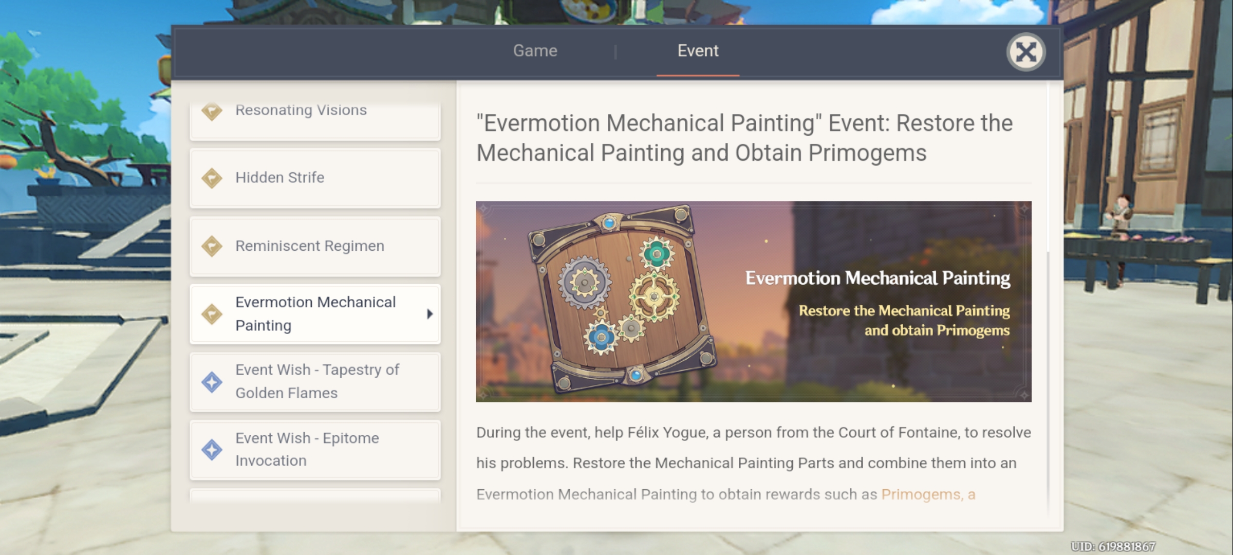 ایونت بعدی که طی این چند روز میاد Evermotion Mechanical Painting هست که شاید کمی گیج کننده باشه ولی با بازی کردن و درست قرار دادن هر چرخ دنده در جای خودش پازل حل میشه. نگران نباشید. تا پایان ورژن 2.8 زمان دارید تا این ایونت رو تموم کنید وکار باهاش رو یاد بگیرید. این ایونت هم پریمو های خوبی جایزه میده پس از دستش ندید. این آخرین ایونت ورژن 2.8 خواهد بود و پس از اون زمان لانچ 3.0 میرسه پس تا میتونید از 2.8 و جزیره و ایونت های Golden Apple Archipelago لذت ببرید.