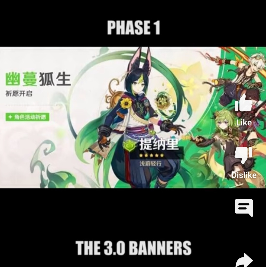 در فاز اول بنر ها کاراکتر 5 ستاره جدید دندرو Tighnary یا (تایناری) خواهد بود و کاراکتر های 4 ستاره بنر اون بنت، بیدو و باز هم یک شخصیت جدید دندرو به نام collei. تایناری bow user هست و سلاحش کمانه در بنر سلاح های ورژن 3.0 فاز اول کمان و شمشیر دندرو عرضه میشه که کمان سلاح اختصاصی تایناری هست.