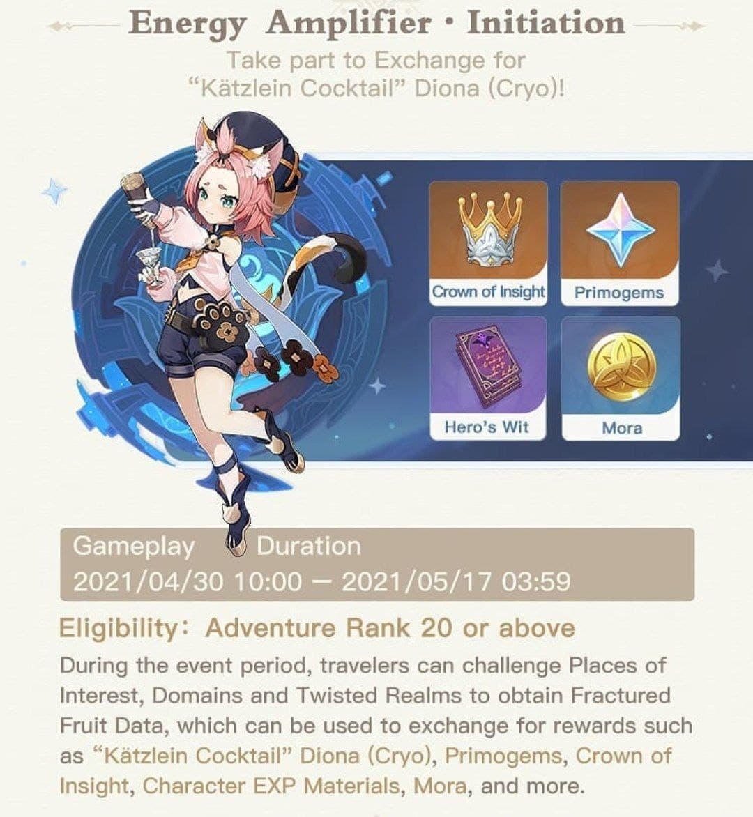- همچنین طبق این اخبار ایونت Energy amplifier در تاریخ 30 اپریل شروع شده و تا 17 میادامه خواهد داشت که جوایز ان را میتوانید در تصویر زیر مشاهده کنید. ( در این ایونت شما شانس گرفتن کرکتر دیونا را نیز دارید )